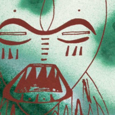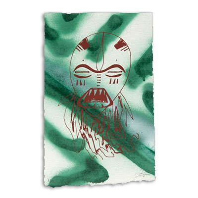 An African-style mask printed onto custom spray-painted Reeves paper. Since the paper was cut by hand, each print has a unique one-of-a-kind background.